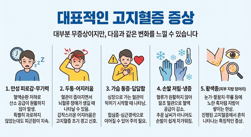 고지혈증 증상은 겉으로 드러나지 않아 많은 사람이 뒤늦게 발견하는 질환입니다. 실제로 대한심장학회는 “고지혈증은 자각 증상이 거의 없어 정기 검진이 필수”라고 강조하며 조기 발견의 중요성을 언급했습니다. 이러한 전문가 의견을 보면 고지혈증 증상을 미리 알고 관리하는 것이 얼마나 중요한지 알 수 있습니다. 이 글을 끝까지 읽으면 고지혈증의 주요 증상, 위험 신호, 관리법까지 쉽게 이해할 수 있습니다.