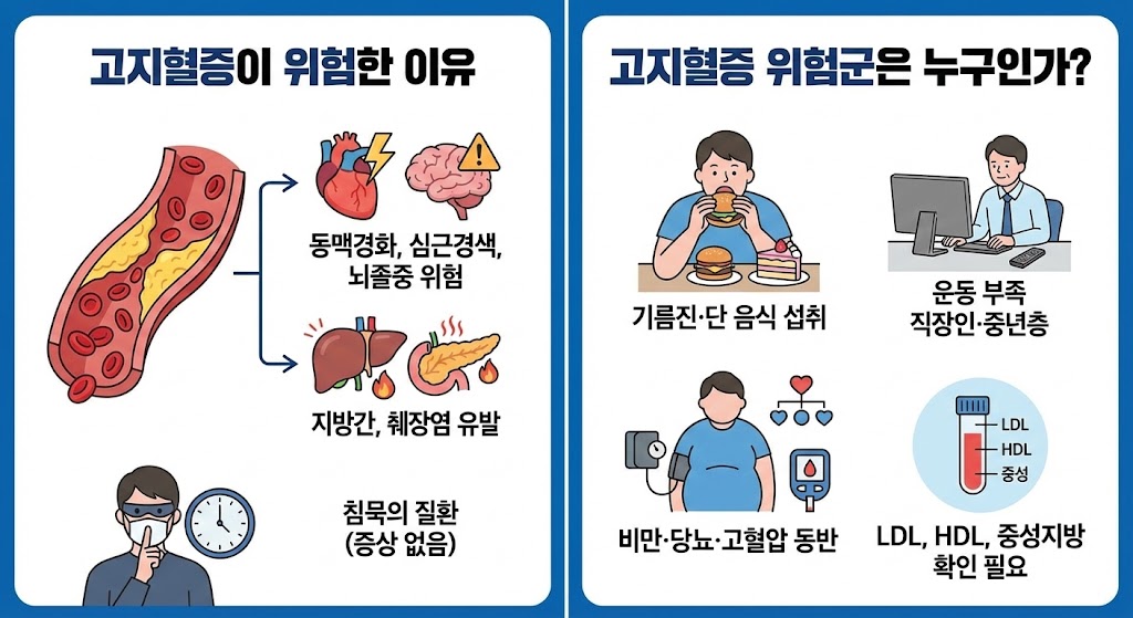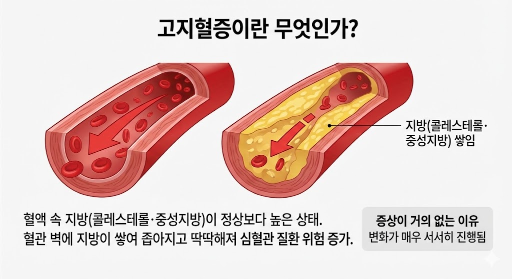고지혈증은 혈액 속 지방(콜레스테롤·중성지방)이 정상 수치보다 높아진 상태를 말합니다. 혈관 벽에 지방이 쌓이면 혈관이 좁아지고 딱딱해져 심혈관 질환으로 이어질 수 있습니다. 고지혈증 증상이 거의 없는 이유는 이 변화가 매우 서서히 진행되기 때문입니다.