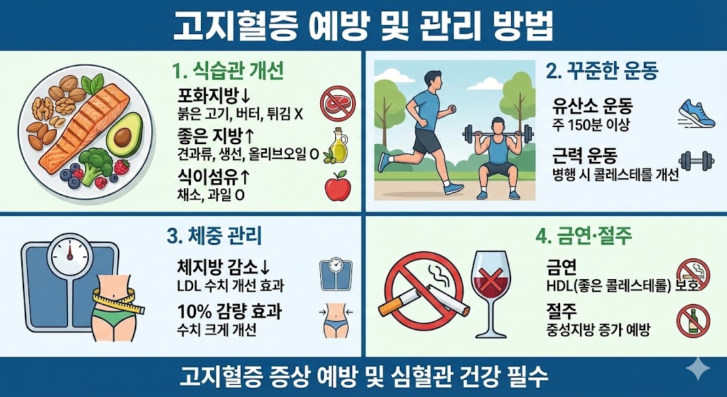이 모든 관리법은 대표적인 고지혈증 증상을 예방하고 심혈관 건강을 지키는 데 필수적입니다.