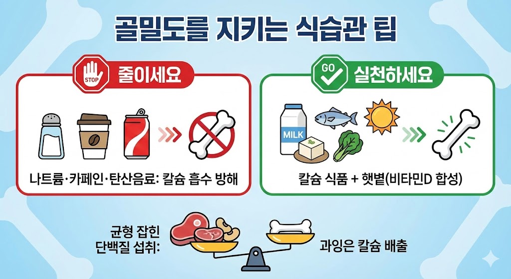 칼슘 흡수를 방해하는 과도한 나트륨·카페인·탄산음료는 줄이는 것이 좋습니다. 또한 골다공증에 좋은 음식과 함께 실내·실외에서 햇볕을 적절히 쬐면 비타민D 합성이 촉진됩니다. 단백질 섭취도 중요하지만 과잉은 칼슘 배출을 유도할 수 있어 균형이 핵심입니다.