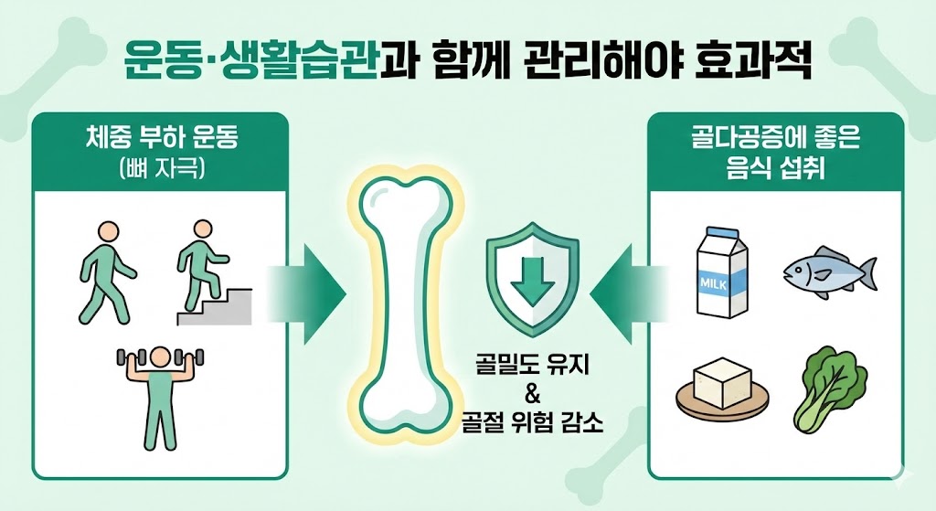 식단만으로는 골다공증을 완전히 예방하기 어렵습니다. 걷기·계단 오르기·근력 운동 등 ‘체중 부하 운동’을 병행해야 뼈 자극이 충분히 일어납니다. 여기에 골다공증에 좋은 음식을 꾸준히 섭취하면 골밀도 유지는 물론 골절 위험을 낮출 수 있습니다.