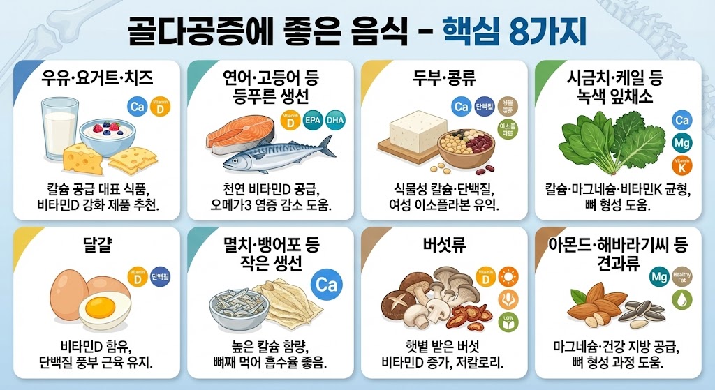 골다공증에 좋은 음식은 칼슘·비타민D·마그네슘·단백질을 중심으로 구성하는 것이 핵심입니다. 우유, 연어, 두부, 견과류 등 일상에서 쉽게 선택할 수 있는 식품만으로도 큰 도움을 줄 수 있습니다. 꾸준한 식습관과 생활관리만 잘 이루어진다면 건강한 뼈를 오래 유지할 수 있습니다.