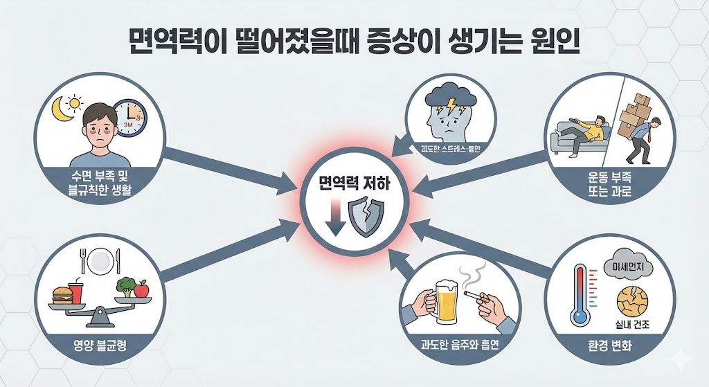 면역 약화는 단일 원인이 아니라 여러 요인이 동시에 작용합니다. 가장 흔한 원인은 다음과 같습니다.