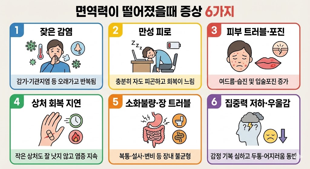 면역력이 떨어졌을 때 나타나는 증상은 우리 몸이 보내는 분명한 경고 신호입니다. 피로감이 쉽게 누적되거나 감기가 자주 걸리고 오래가는 경우, 소화불량이나 설사, 변비가 반복되며, 피부 트러블이나 염증이 자주 생긴다면 면역 저하를 의심해볼 수 있습니다.