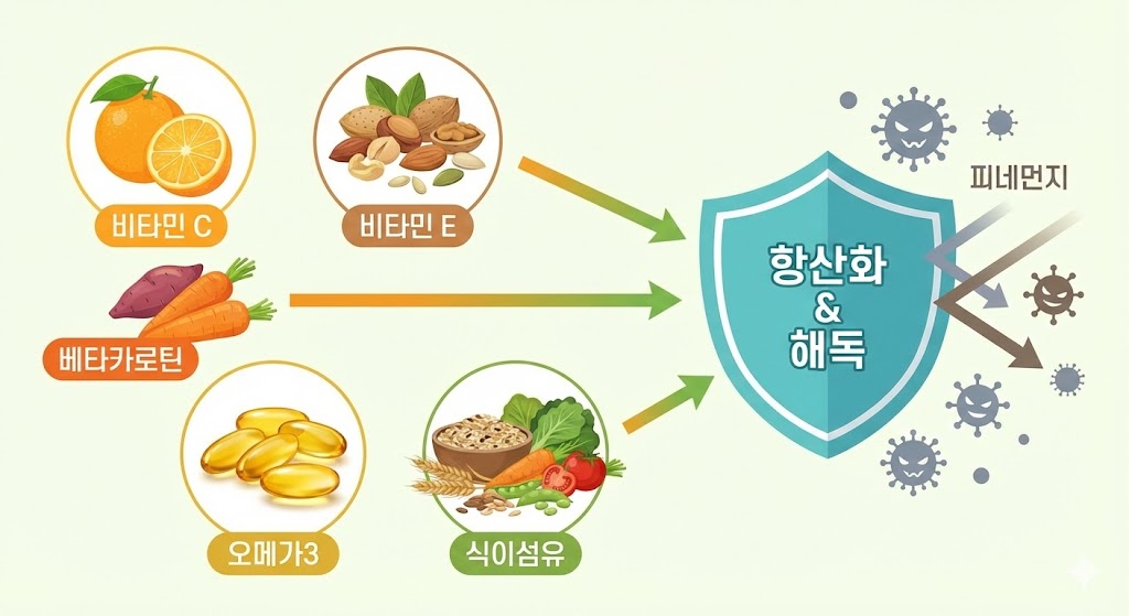 미세먼지에 대응하려면 비타민 C·E, 베타카로틴, 오메가3, 식이섬유 등 항산화 영양소의 균형 잡힌 섭취가 중요합니다. 특히 녹황색 채소와 과일은 꾸준히 먹으면 체내 염증 반응을 낮추는 데 도움이 됩니다.
