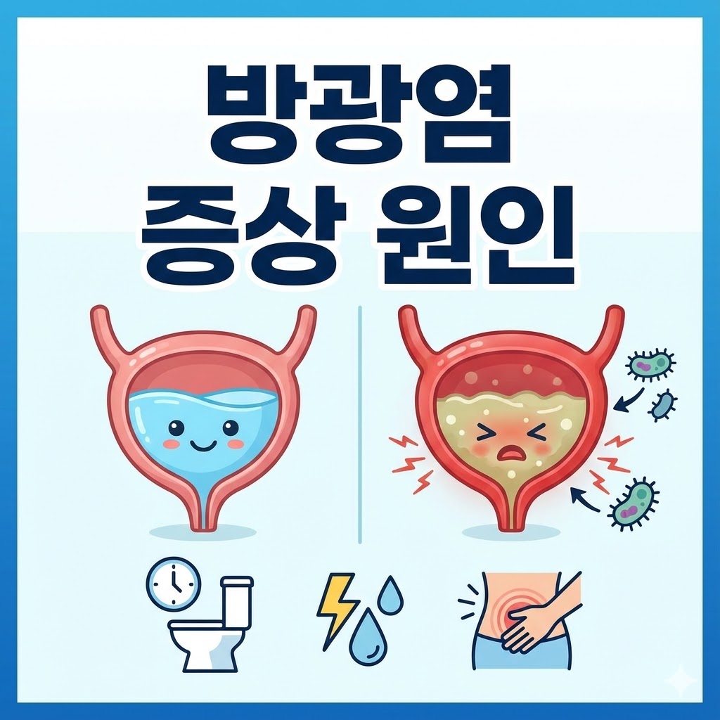 방광염은 방광에 세균이 침투해 염증이 생긴 질환으로, 대부분 대장균이 요도를 통해 들어와 감염을 일으킵니다. 여성의 요도가 짧고 요도 입구가 질과 항문에 가까워 세균이 쉽게 침투하기 때문에 여성에게 특히 자주 발생합니다.