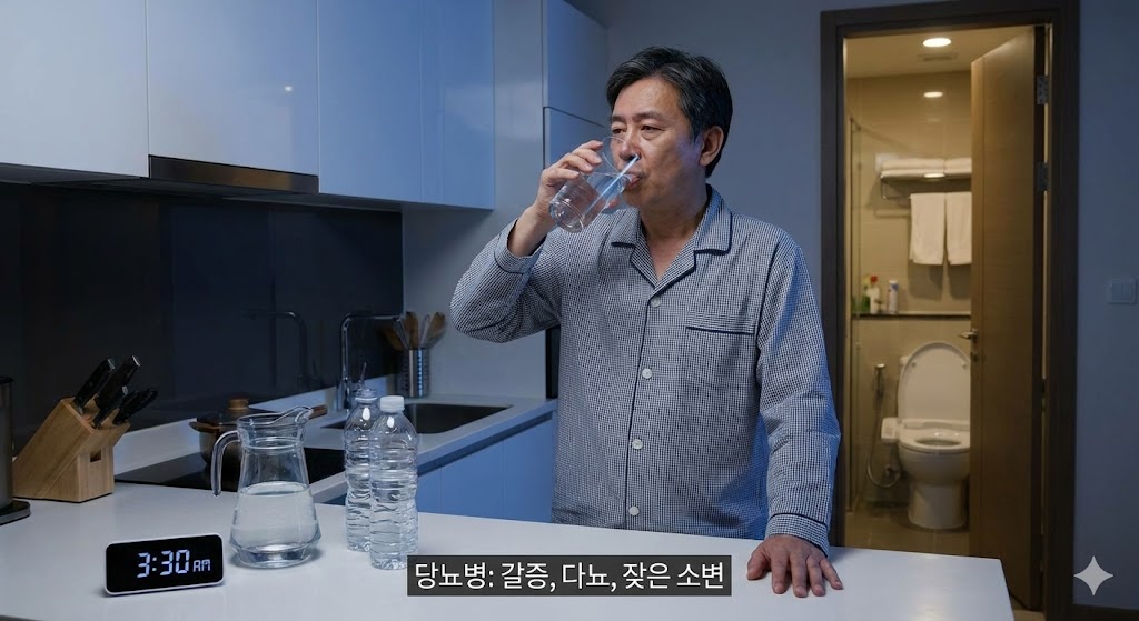 - 이로 인해 갈증과 다뇨(소변 과다)가 동시에 나타납니다.