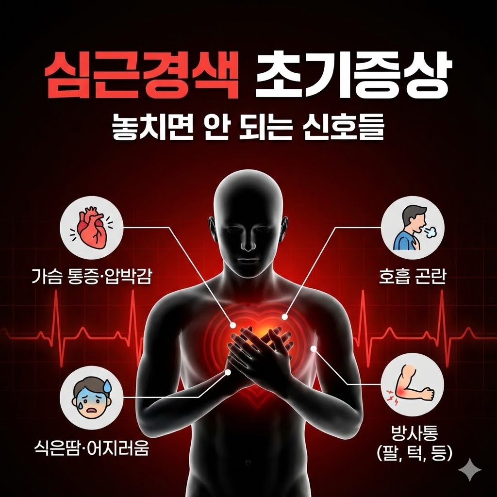 심근경색은 발생 순간의 대처도 중요하지만, 무엇보다 조기 신호를 알아차리는 것이 생명을 살리는 핵심입니다. 평소와 다른 가슴 통증, 호흡곤란, 식은땀, 소화불량 등의 증상은 모두 심근경색 초기증상일 수 있으므로 절대 방치해선 안 됩니다.