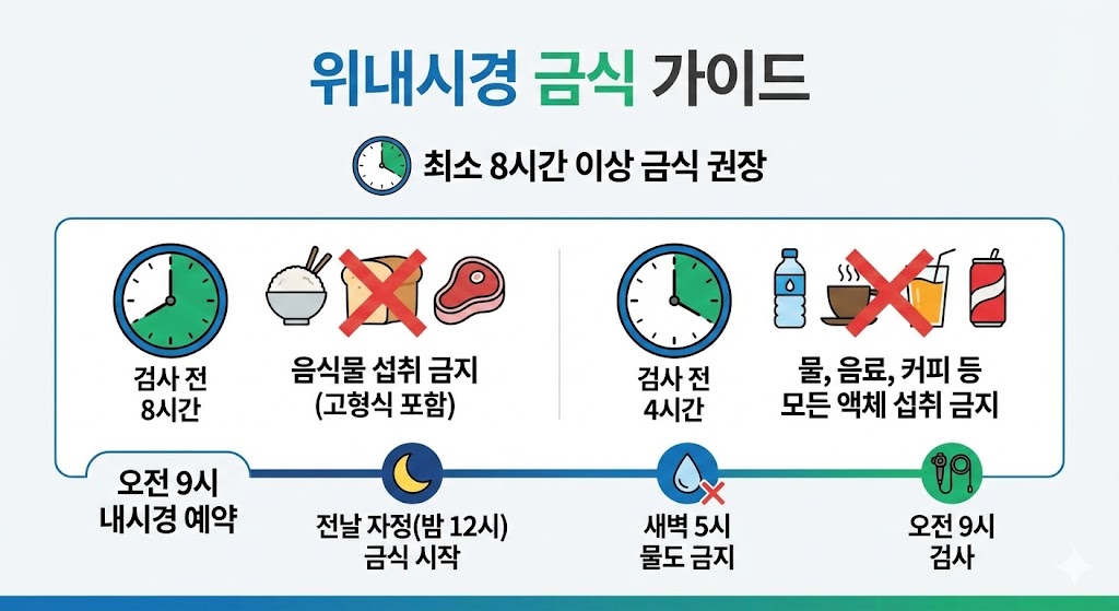 위내시경 금식시간 은 단순한 약속이 아니라 정확한 진단을 위한 필수 조건입니다. 고형식은 최소 8시간, 물은 2시간 금식하는 것이 기본이며, 특수 질환이나 수면내시경 여부에 따라 조정이 필요할 수 있습니다.