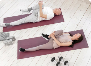- 바닥에 누워 무릎을 세우고 발은 골반 너비로 벌립니다.